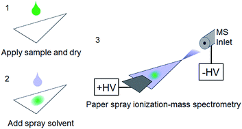 In this proof-of-concept study paper spray mass spectrometry was investigated as a high-throughput and fully automated technique for the initial testing of particularly polar compounds that are prohibited in sports. It is a variant of electrospray ionization. We propose the use of paper spray ionizationhigh-resolution mass spectrometry PSI-HRMS for detection of peroxide explosives in biological matrices. Ions are emitted from the paper and enter a mass spectrometer for sensitive and selective semi-quantitation using labeled internal standards. Paper spray ionization mass spectrometry PSI-MS is an ambient MS approach that typically involves the direct analysis of a relatively small volume of unextracted biological sample deposited onto paper PSI-MS offers several advantages over conventional liquid chromatography LC-MS approaches including minimal sample. Paper spray mass spectrometry - A potential complementary technique for the detection of polar compounds in sports drug testing. Paper spray mass spectrometry was first described in the literature in 2010 1 as a simple method for rapid analysis using a precut piece of paper to simultaneously extract and ionise a sample deposited on a porous substrate. While distinct advantages of paper spray have been demonstrated especially for quantitative analysis and design of disposable sample cartridges the need for improvement has also been recognized especially for the use with miniature mass spectrometers. Prior separations are an option.